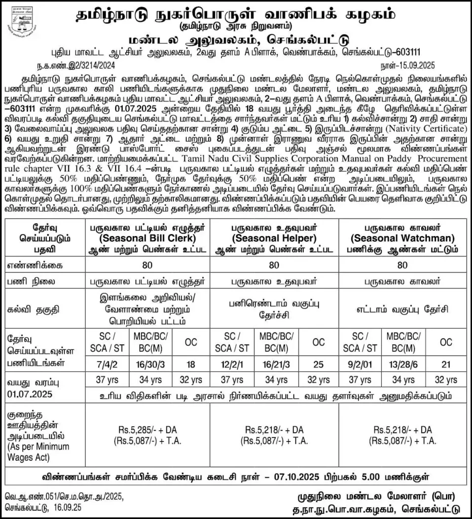 TNCSC Chengalpattu Recruitment 2025: Tamil Nadu Civil Supplies Corporation Chengalpattu (TNCSC Chengalpattu) has released a notification at tncsc.tn.gov.in for recruitment to the Post of Seasonal Bill Clerk in Chengalpattu – Tamil Nadu. Interested candidates can Apply Offline on or before 07-Oct-2025